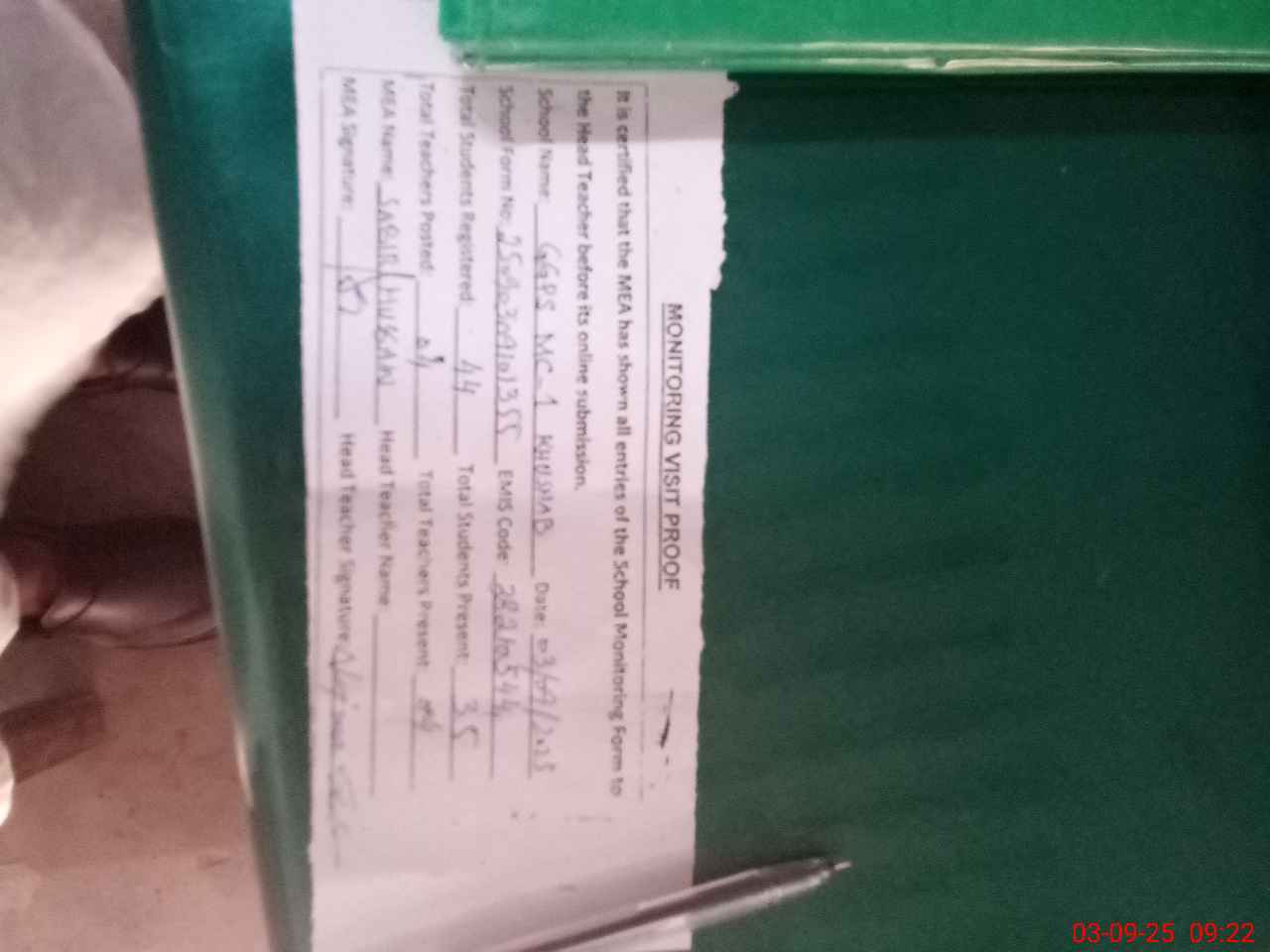| Attendance Register | Head Teacher | MEA with School | Visit Proof |