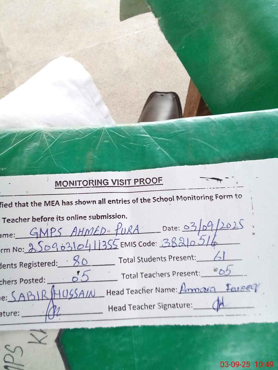 | EMIS Code: 38210516 | Name of School: GMPS AHMAD PURA | |||