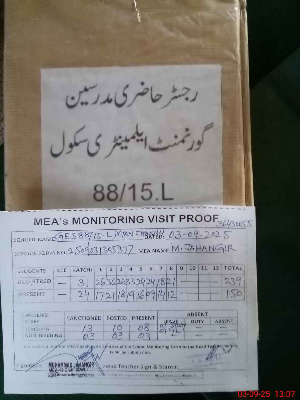 | Attendance Register | Head Teacher | MEA with School | Visit Proof |