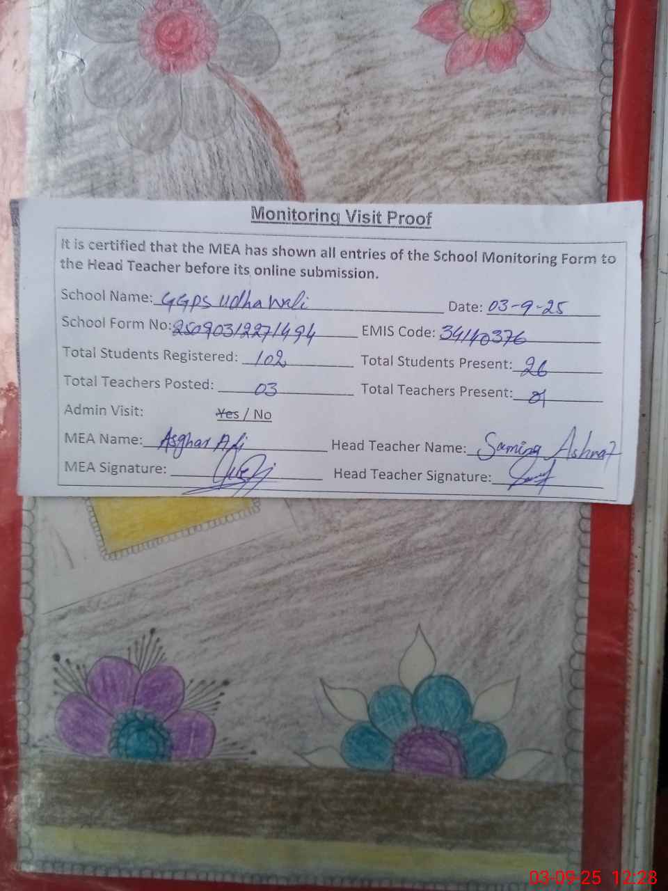 | Attendance Register | Head Teacher | MEA with School | Visit Proof |