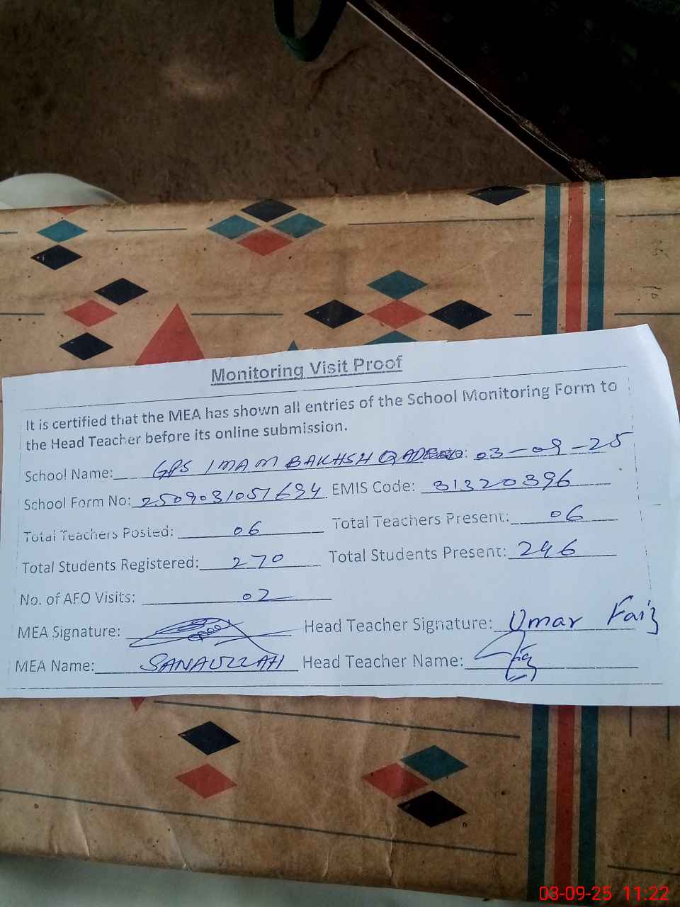 | EMIS Code: 31320396 | Name of School: GPS IMAM BAKHSH QADEEM | |||