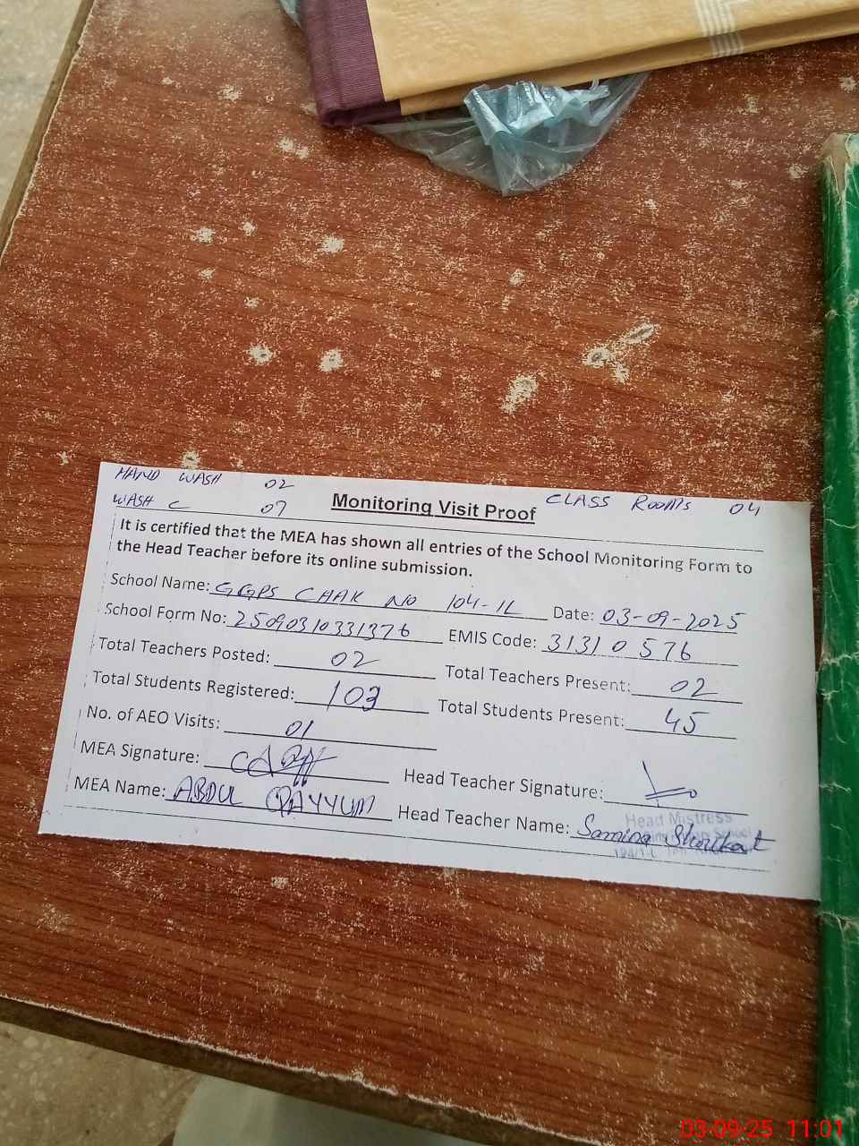 | Attendance Register | Head Teacher | MEA with School | Visit Proof |
