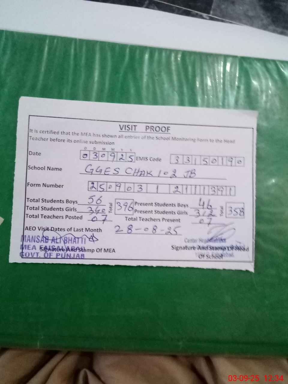| Certified that this School was Inspected by the Undersigned MEA/DMO Today and the Information Stated Above is as Per Record. | |||||