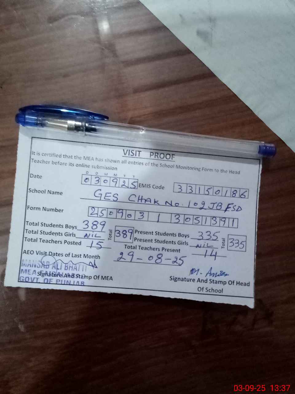 | Attendance Register | Head Teacher | MEA with School | Visit Proof |