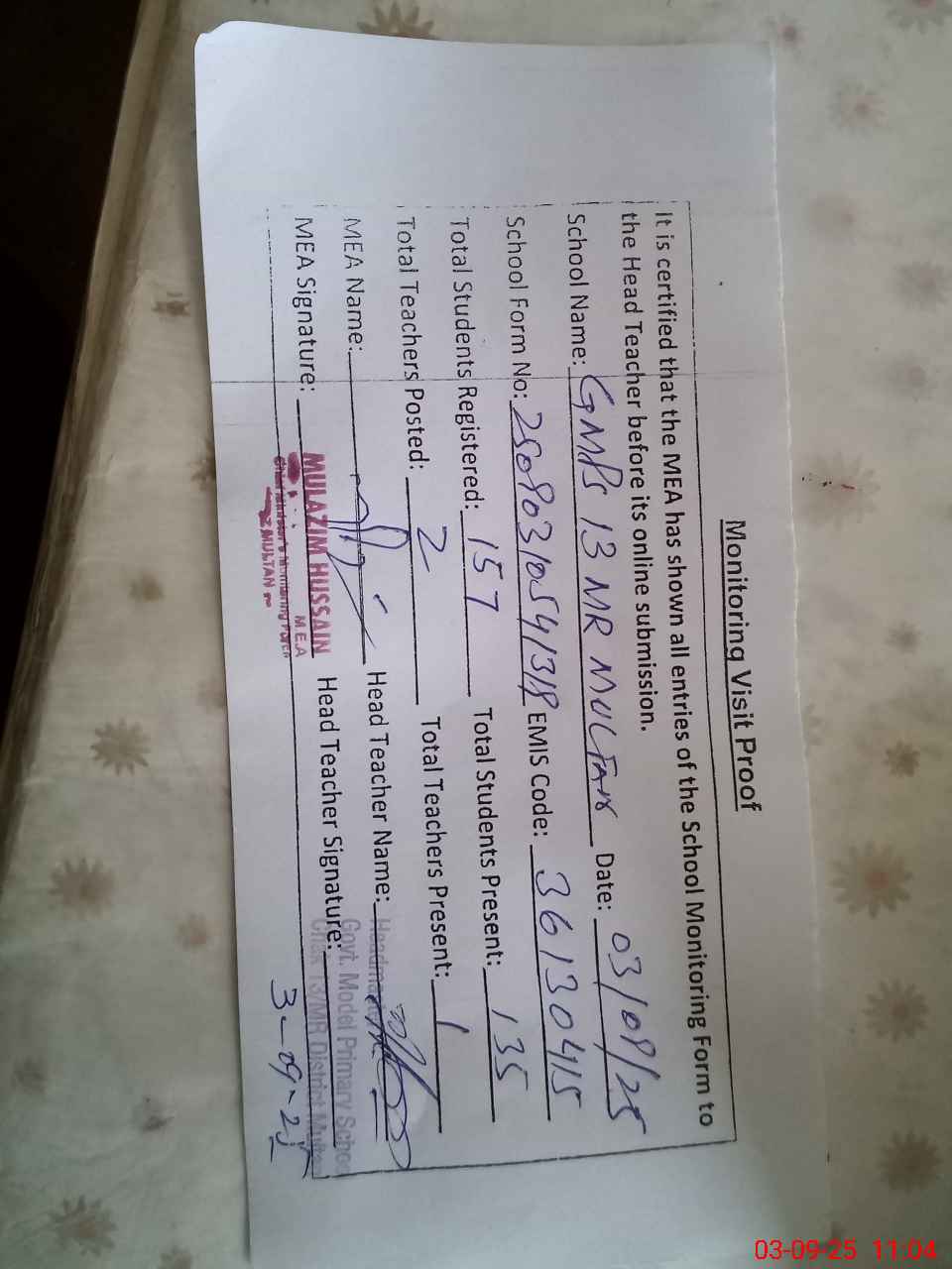 | Attendance Register | Head Teacher | MEA with School | Visit Proof |