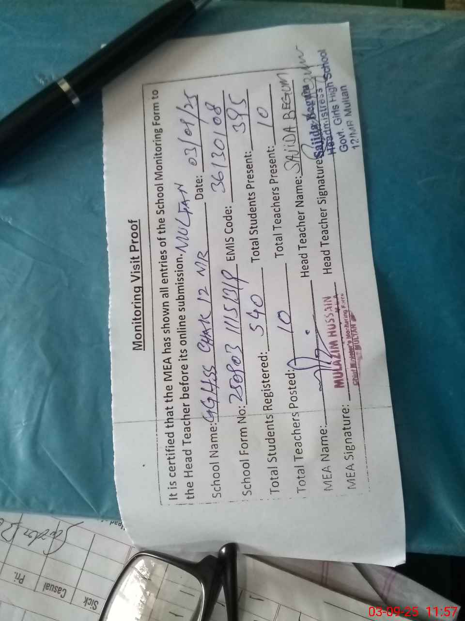 | Attendance Register | Head Teacher | MEA with School | Visit Proof |