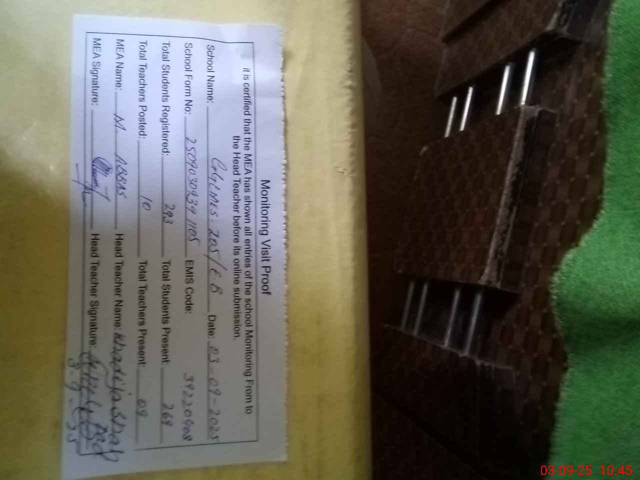 | Attendance Register | Head Teacher | MEA with School | Visit Proof |