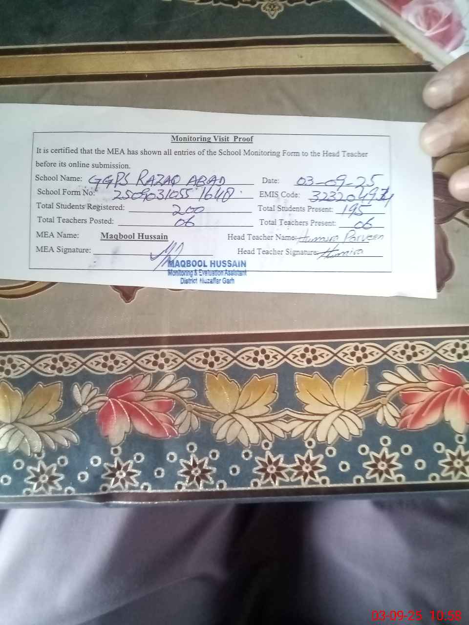 | Attendance Register | Head Teacher | MEA with School | Visit Proof |