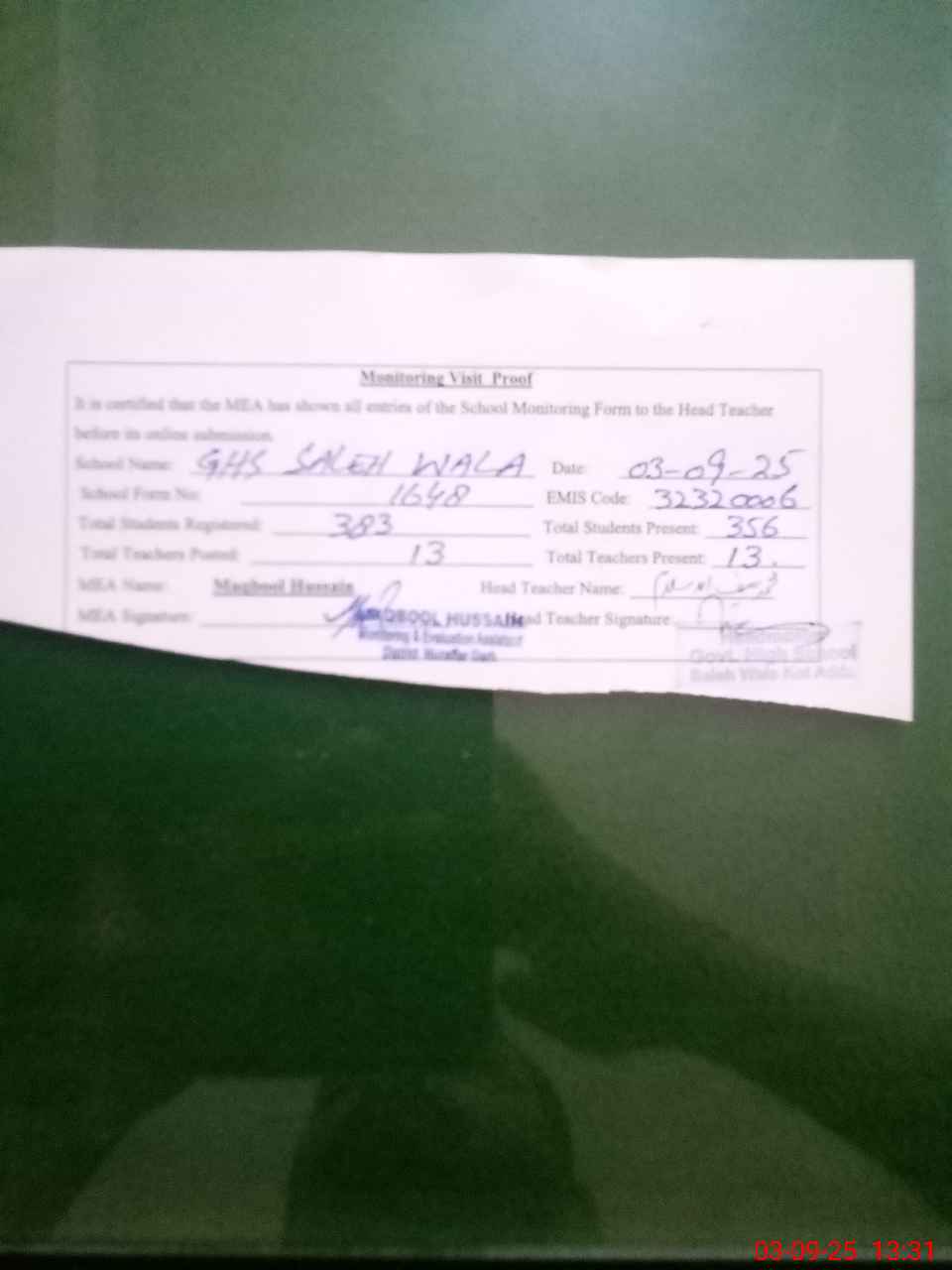 | EMIS Code: 32320006 | Name of School: GHS SALEH WALA | |||