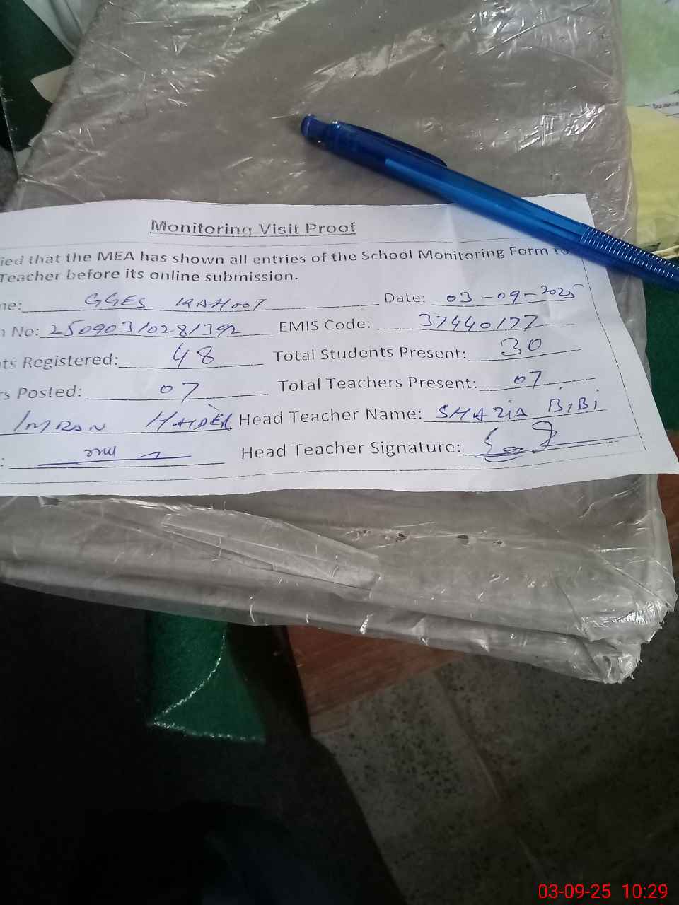 | Attendance Register | Head Teacher | MEA with School | Visit Proof |