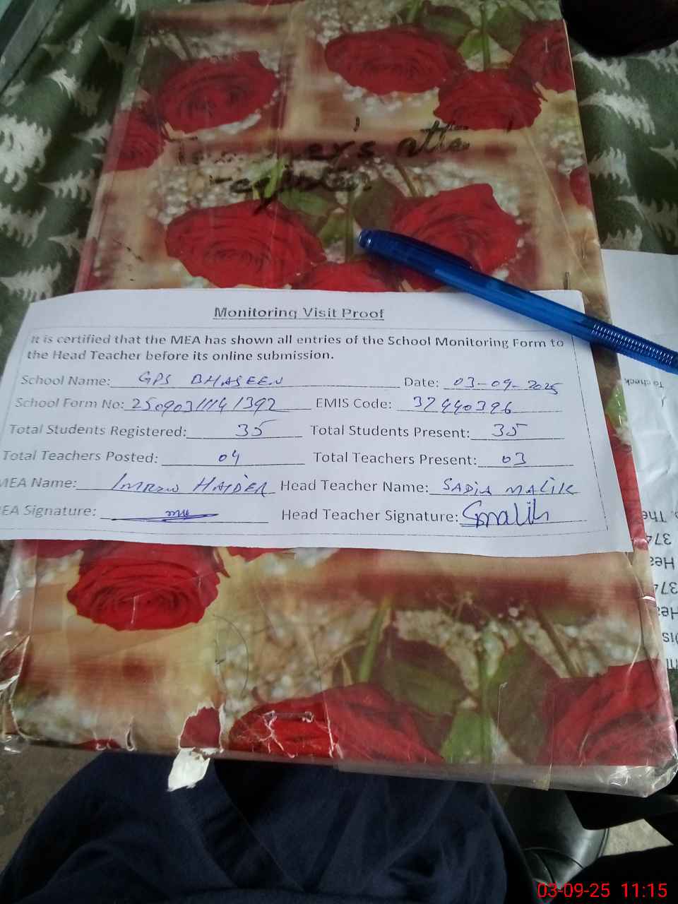 | Attendance Register | Head Teacher | MEA with School | Visit Proof |