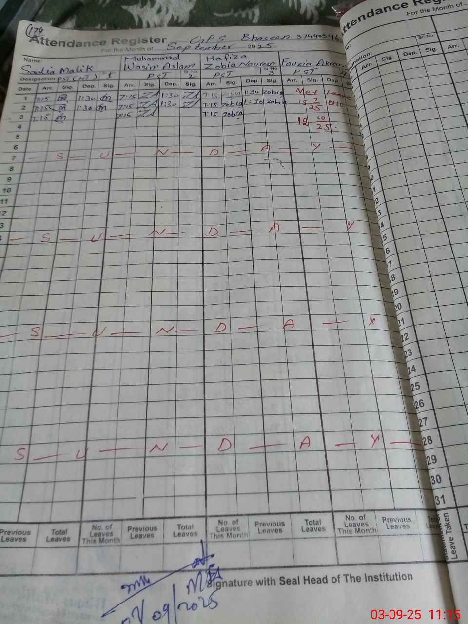 | No. of Students Present - Male | 4 | 0 | 11 | 3 | 4 | 0 | 3 | 2 | 27 | |||||||