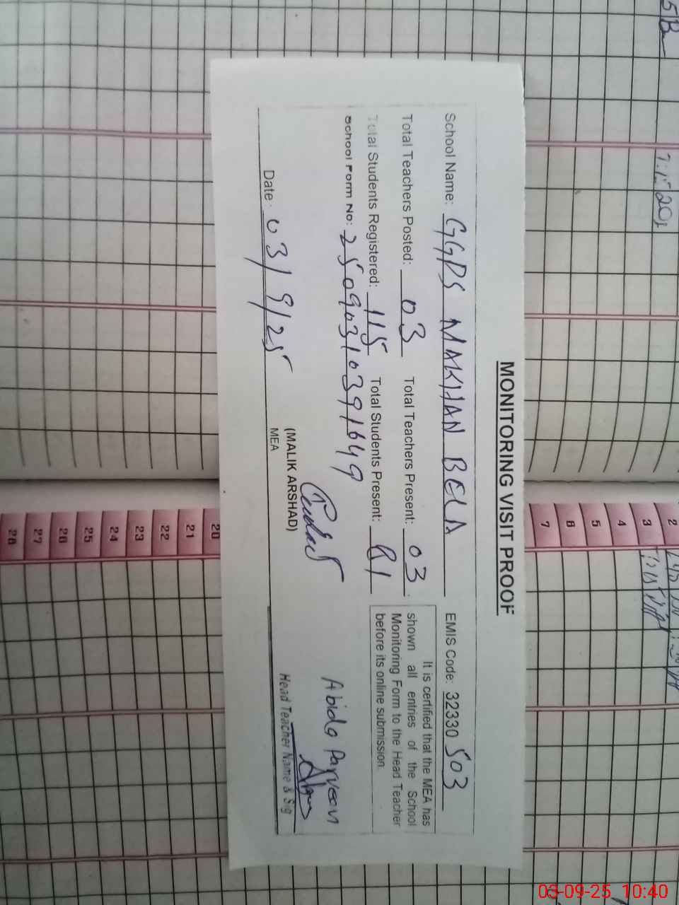 | Attendance Register | Head Teacher | MEA with School | Visit Proof |