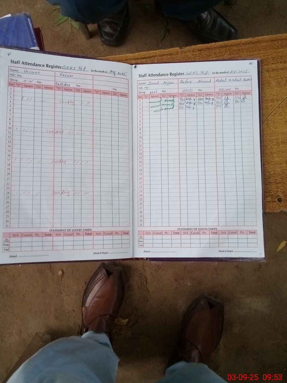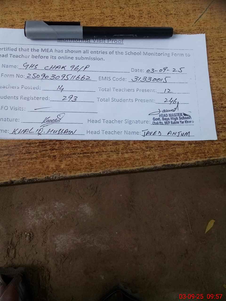 | Attendance Register | Head Teacher | MEA with School | Visit Proof |