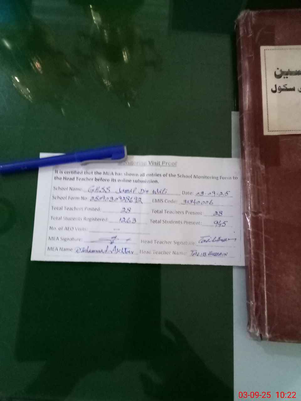 | Remarks (Use Separate Page if Required): Teacher Muhammad anwer expired on 26 July 2025 06 toilet non functional | |||||
