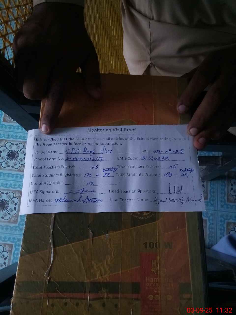 | Attendance Register | Head Teacher | MEA with School | Visit Proof |