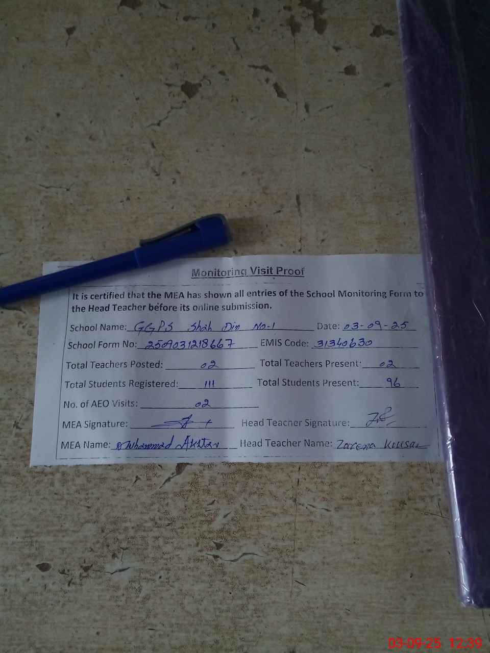 | Attendance Register | Head Teacher | MEA with School | Visit Proof |