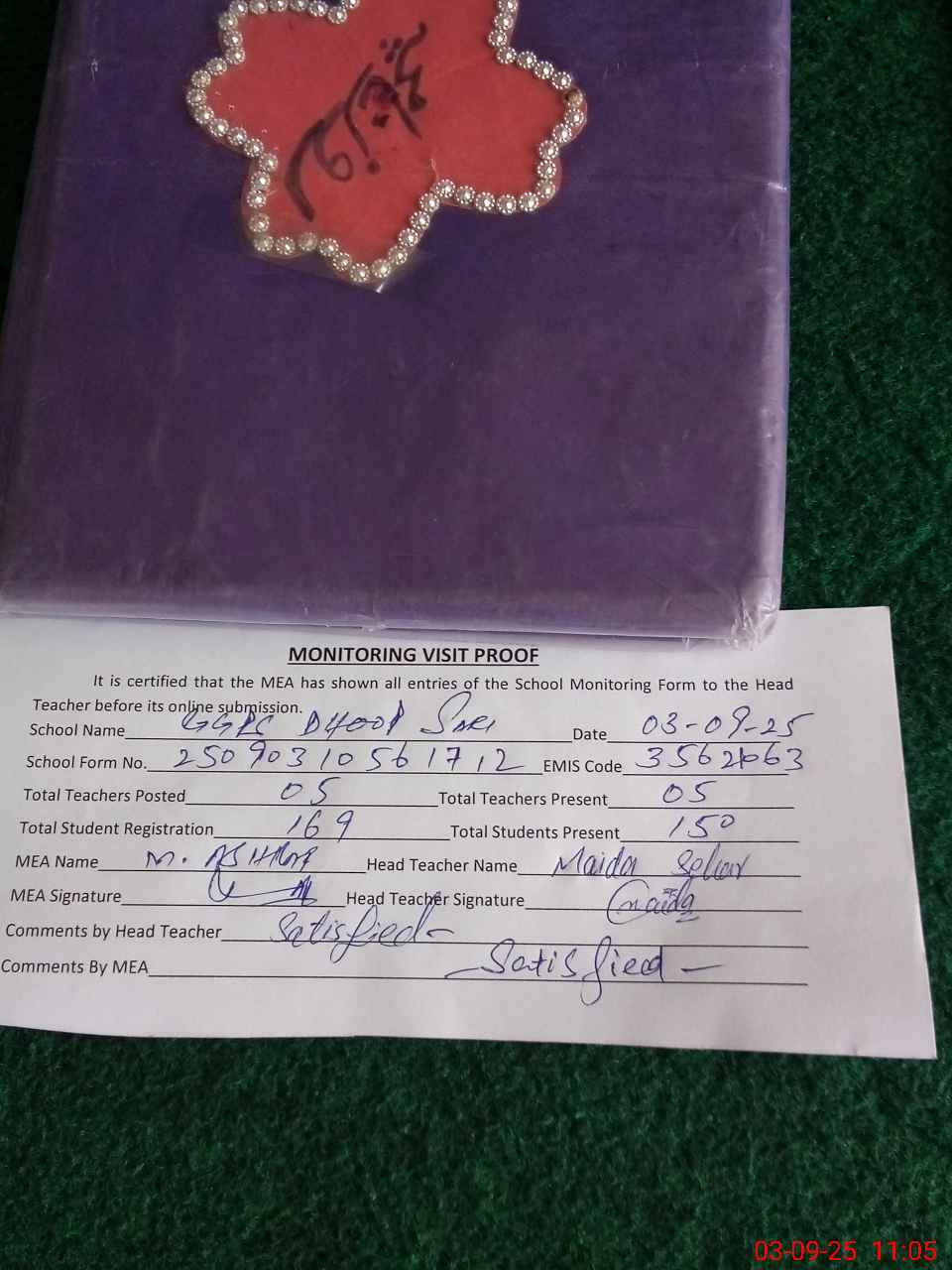 | Attendance Register | Head Teacher | MEA with School | Visit Proof |