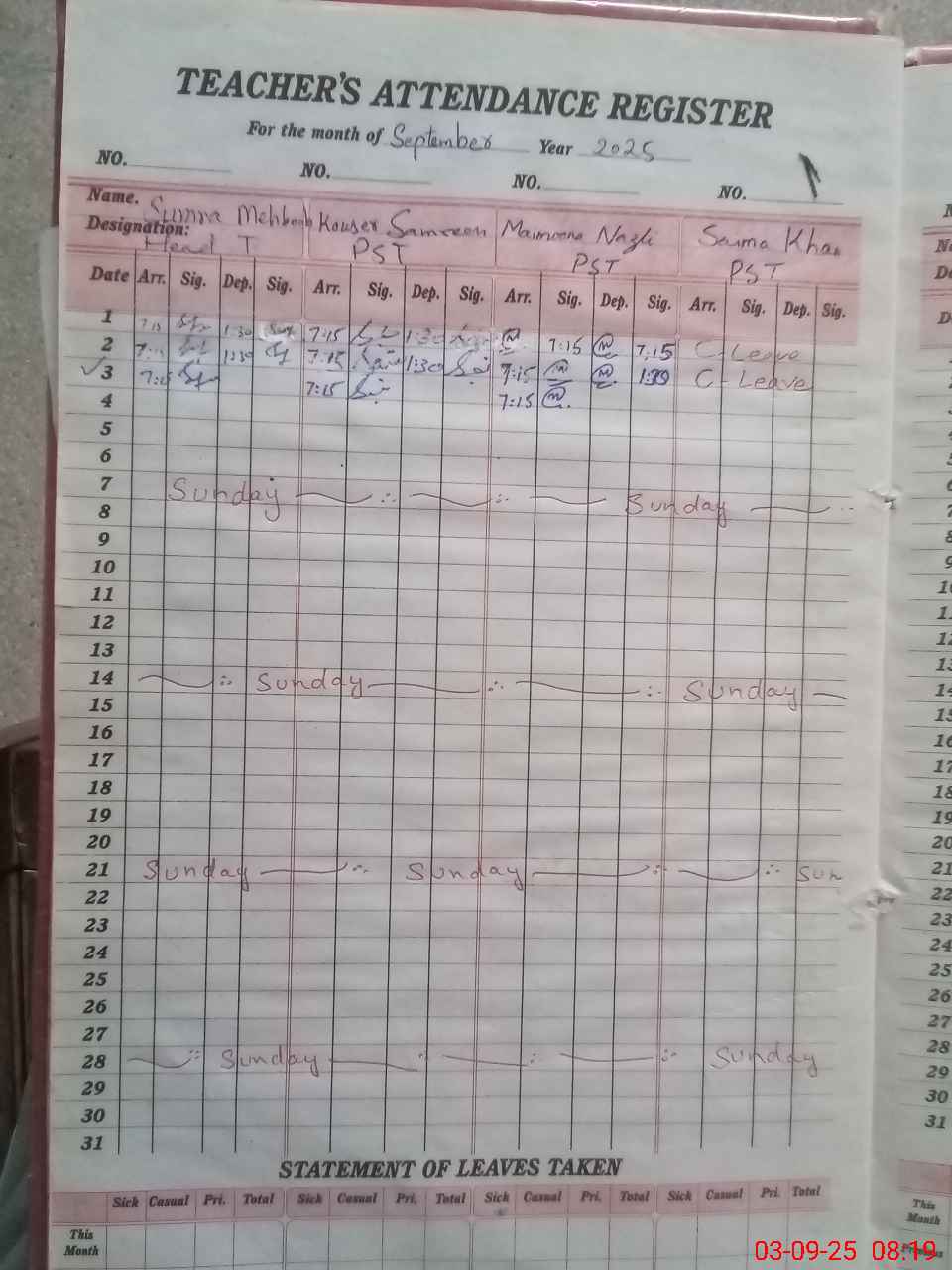 | 38**** | Sa**** Kh**** | 2 | 2 | 0 | 0 | 0 | 0 | 0 | 0 | 0 | 0 | 0 | Absent (Un-Authorized) |
