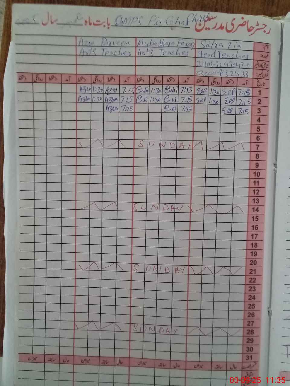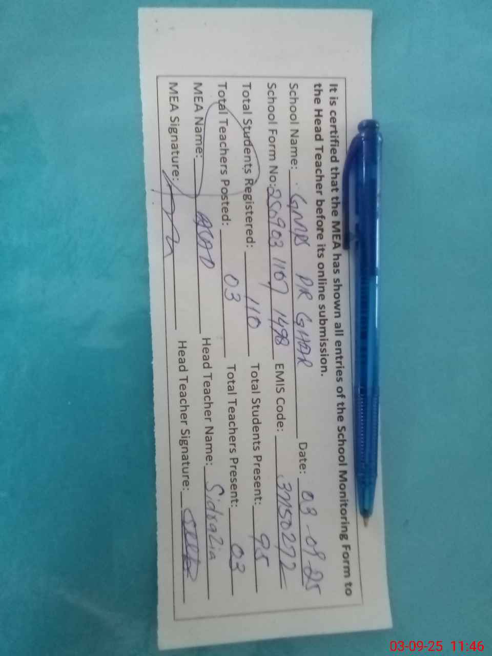 | EMIS Code: 31150272 | Name of School: GMPS PIR GHAR CHISHTI | |||