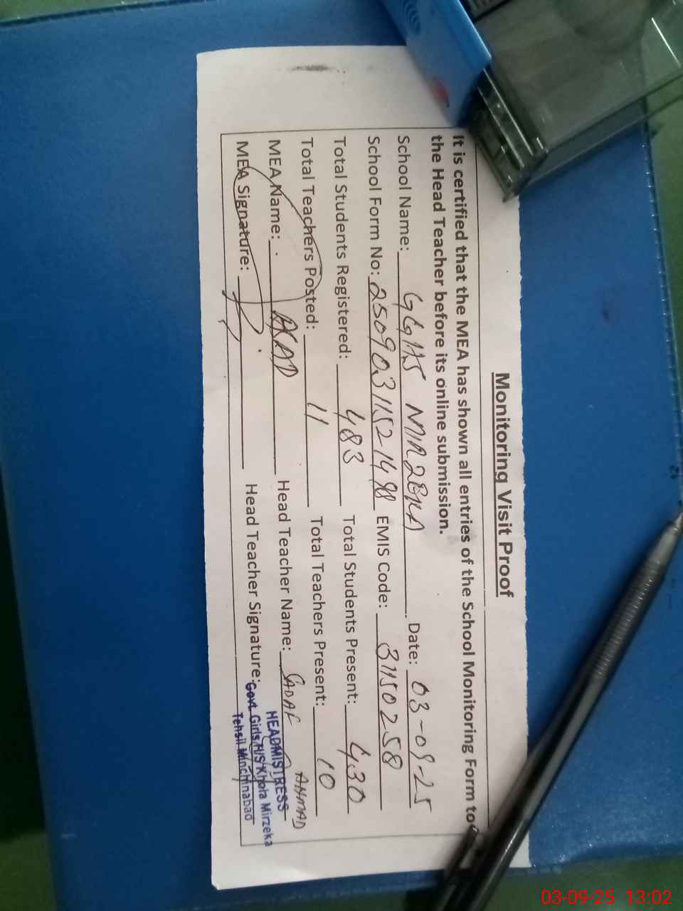 | Attendance Register | Head Teacher | MEA with School | Visit Proof |