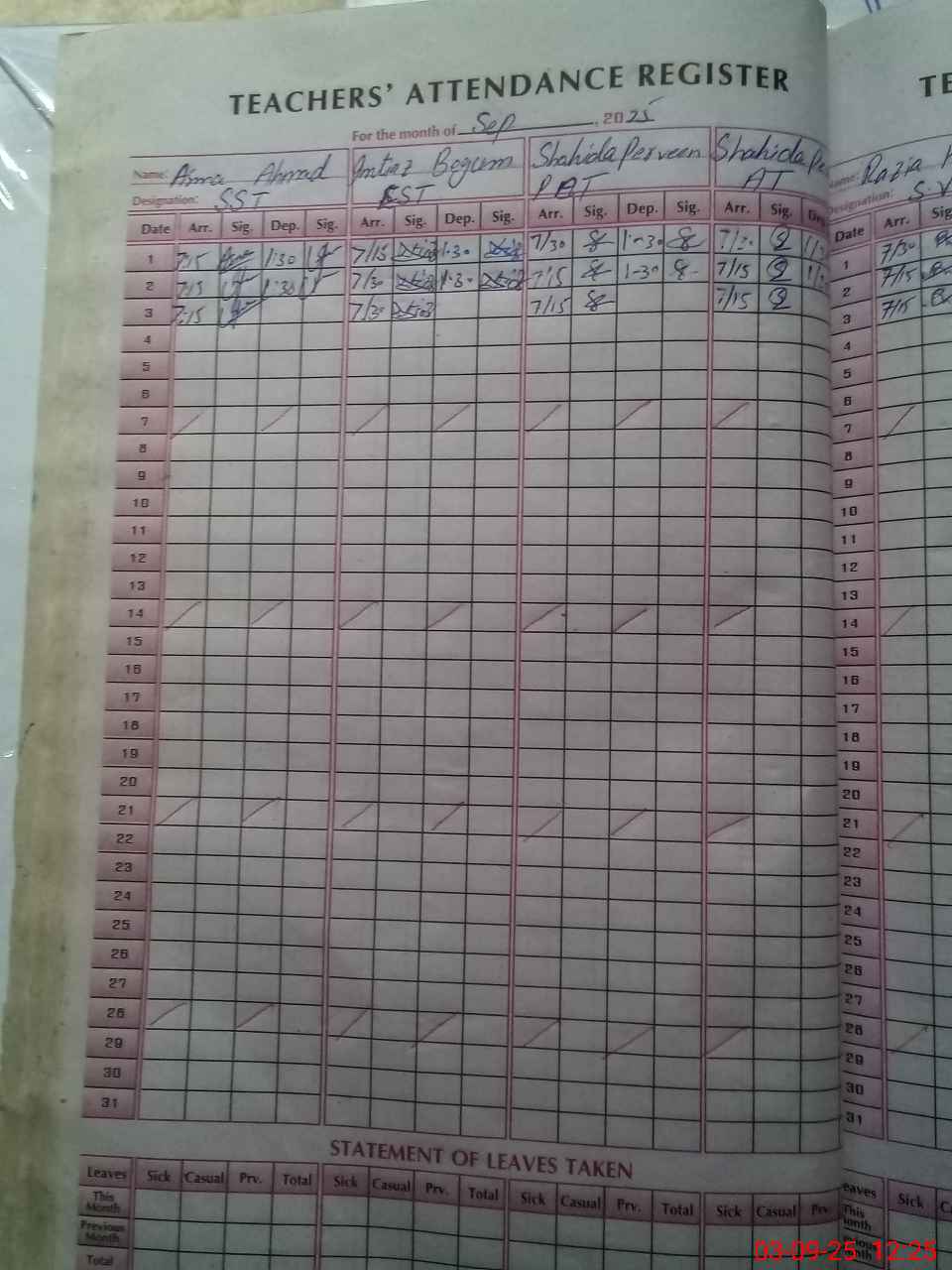 | No. of Students Present - Female | 4 | 0 | 37 | 25 | 16 | 15 | 13 | 22 | 17 | 29 | 24 | 23 | 19 | 244 | ||