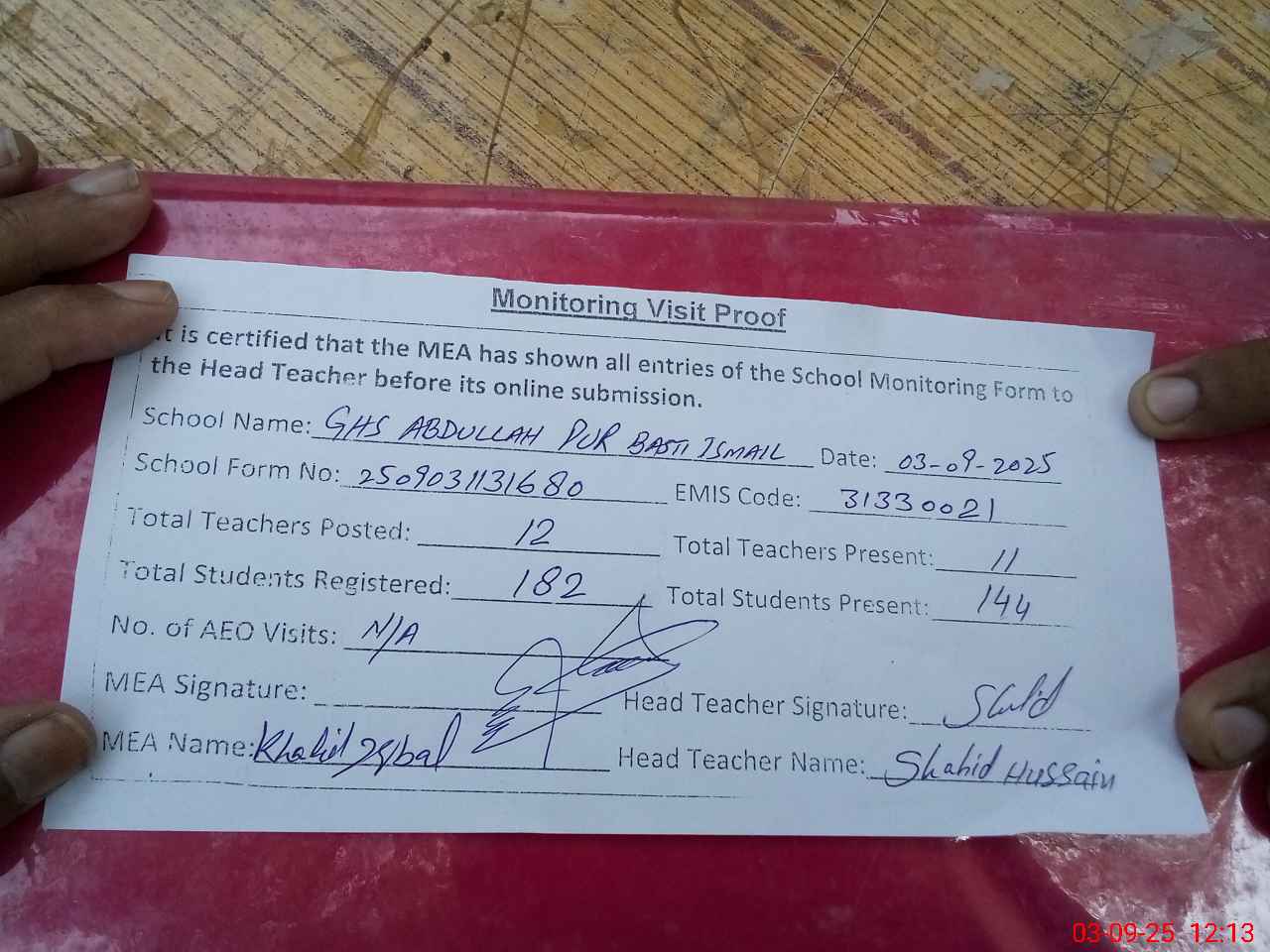 | EMIS Code: 31330021 | Name of School: GHS ABDULLAH PUR BASTI ISMAIL | |||