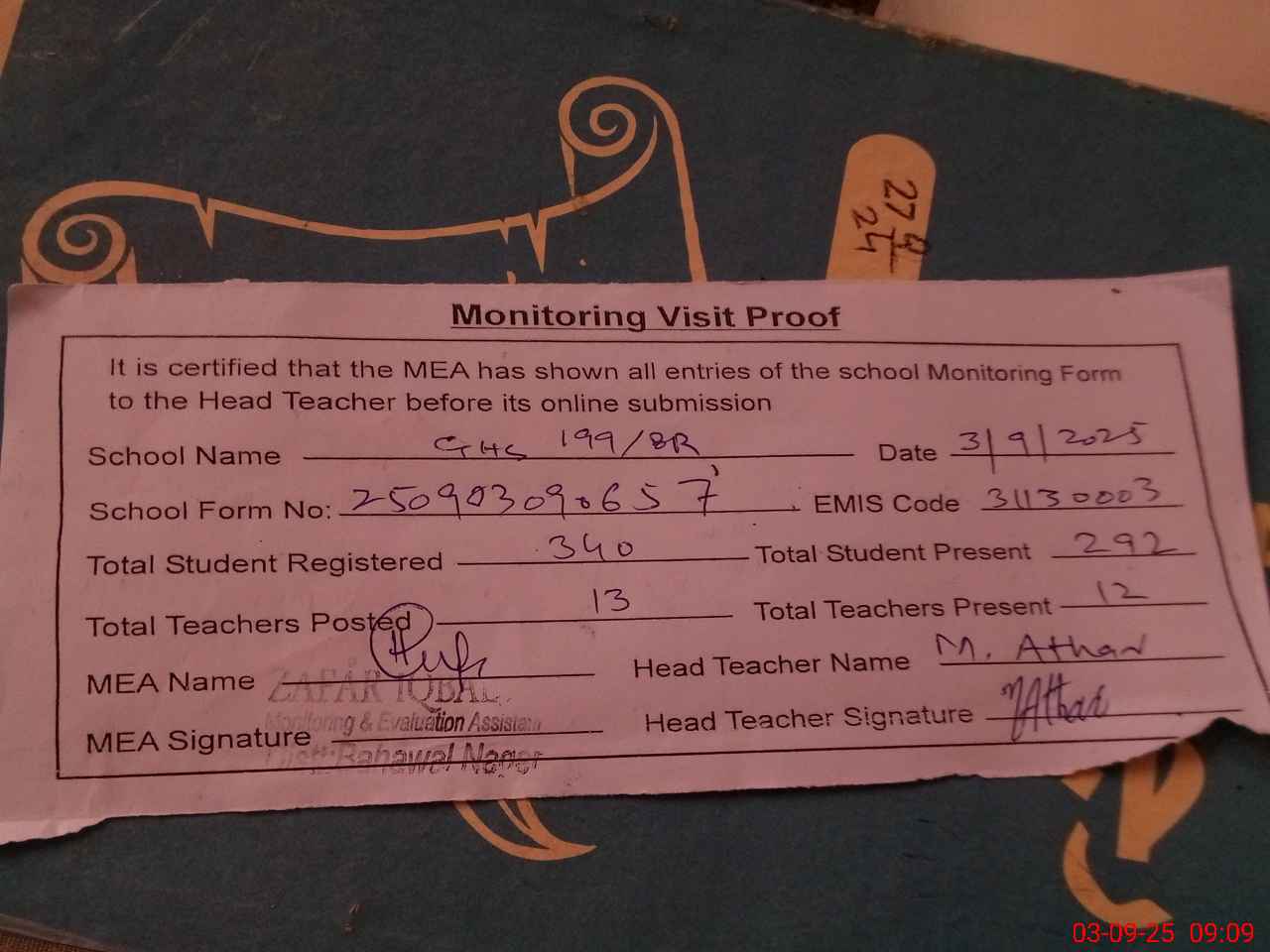 | Attendance Register | Head Teacher | MEA with School | Visit Proof |
