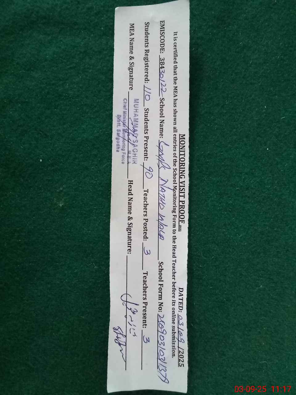 | Monitoring Date: 03-09-2025 | Start Time: 03-09-2025 10:31 AM | End Time: 03-09-2025 11:18 AM | Name of MEA: MU**** SA**** | |