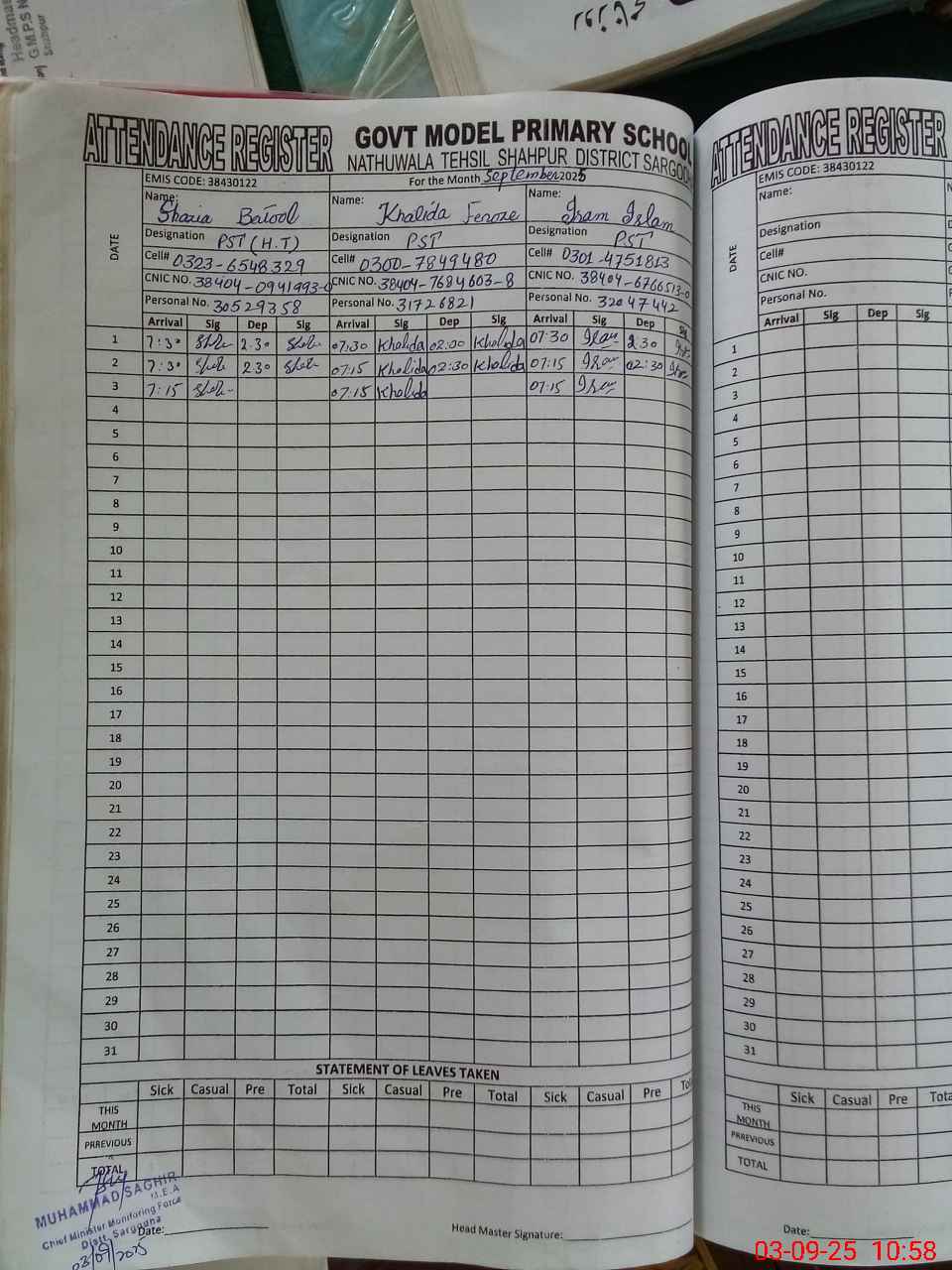 | Name: SH**** BA**** Designation: (School Headmaster's/Headmistress's) PST Phone/Cell Number: 03**** |