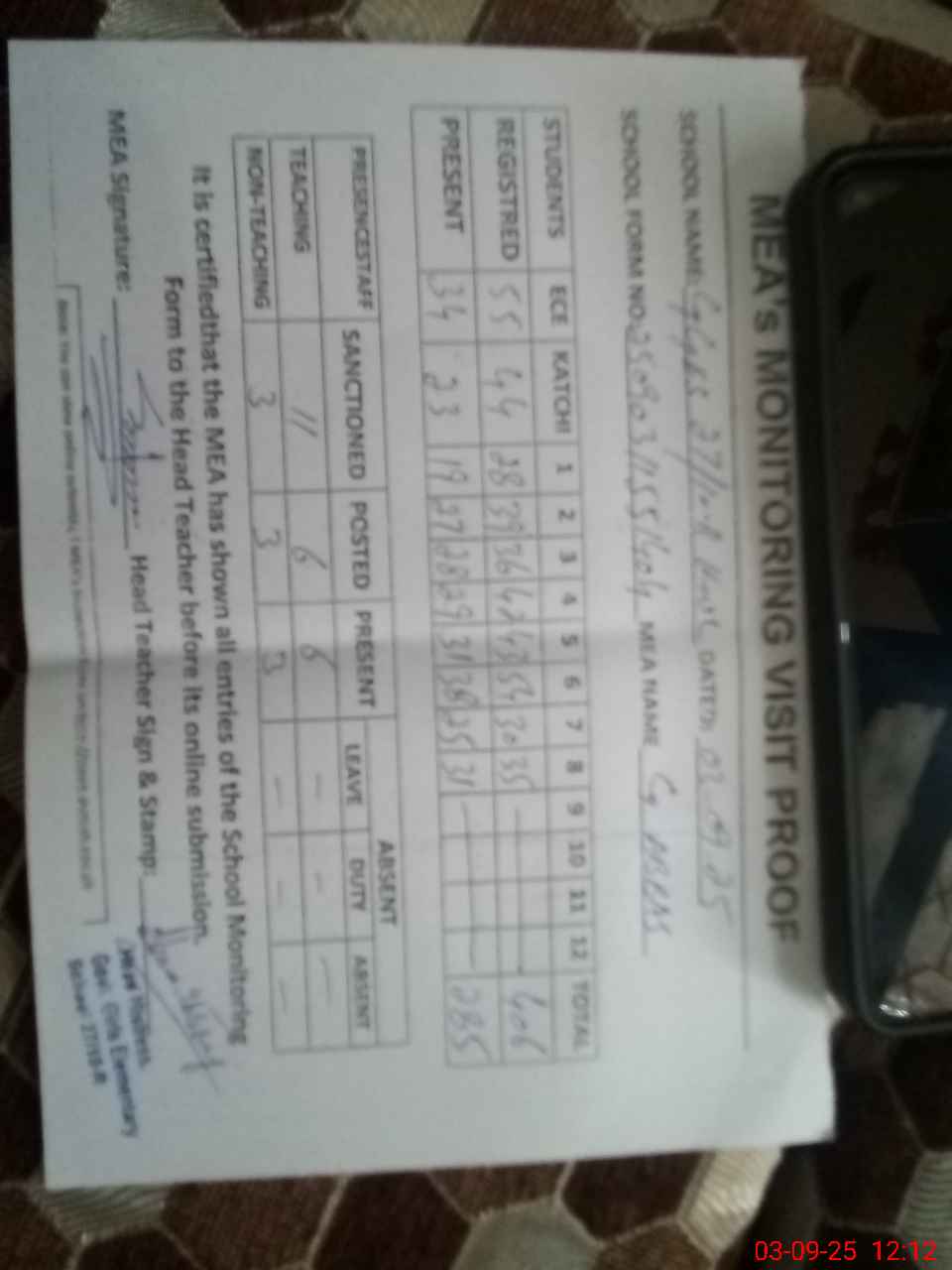 | Attendance Register | Head Teacher | MEA with School | Visit Proof |
