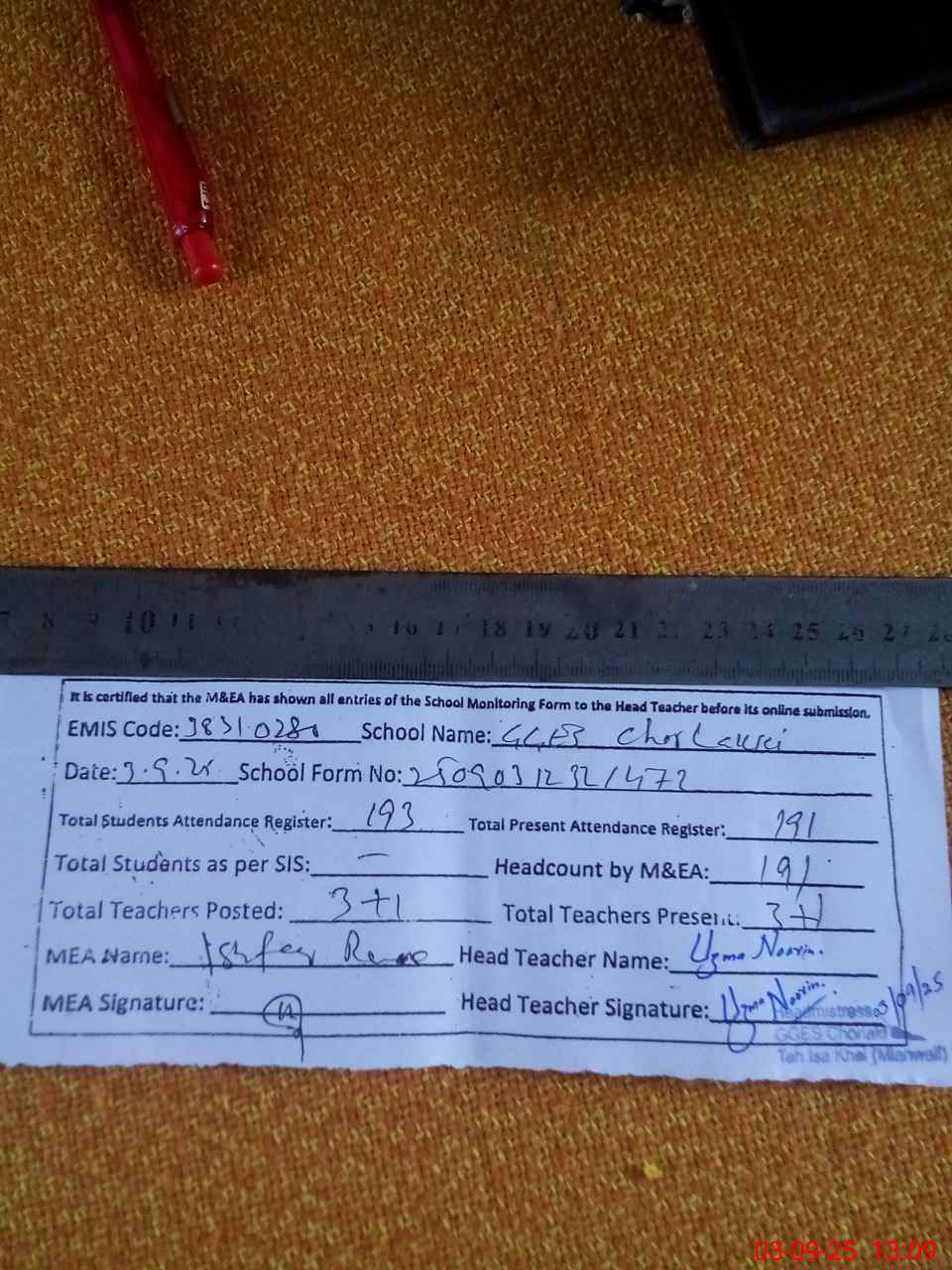 | Attendance Register | Head Teacher | MEA with School | Visit Proof |