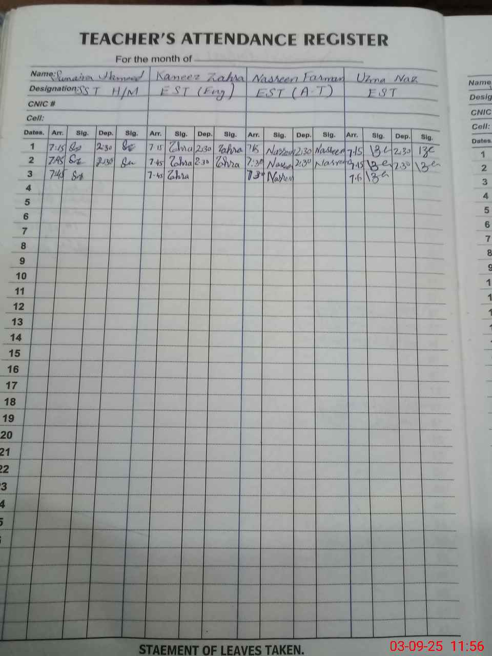 | CNIC | Full Name | Designation | R/C | Absence During Last Calender Month |