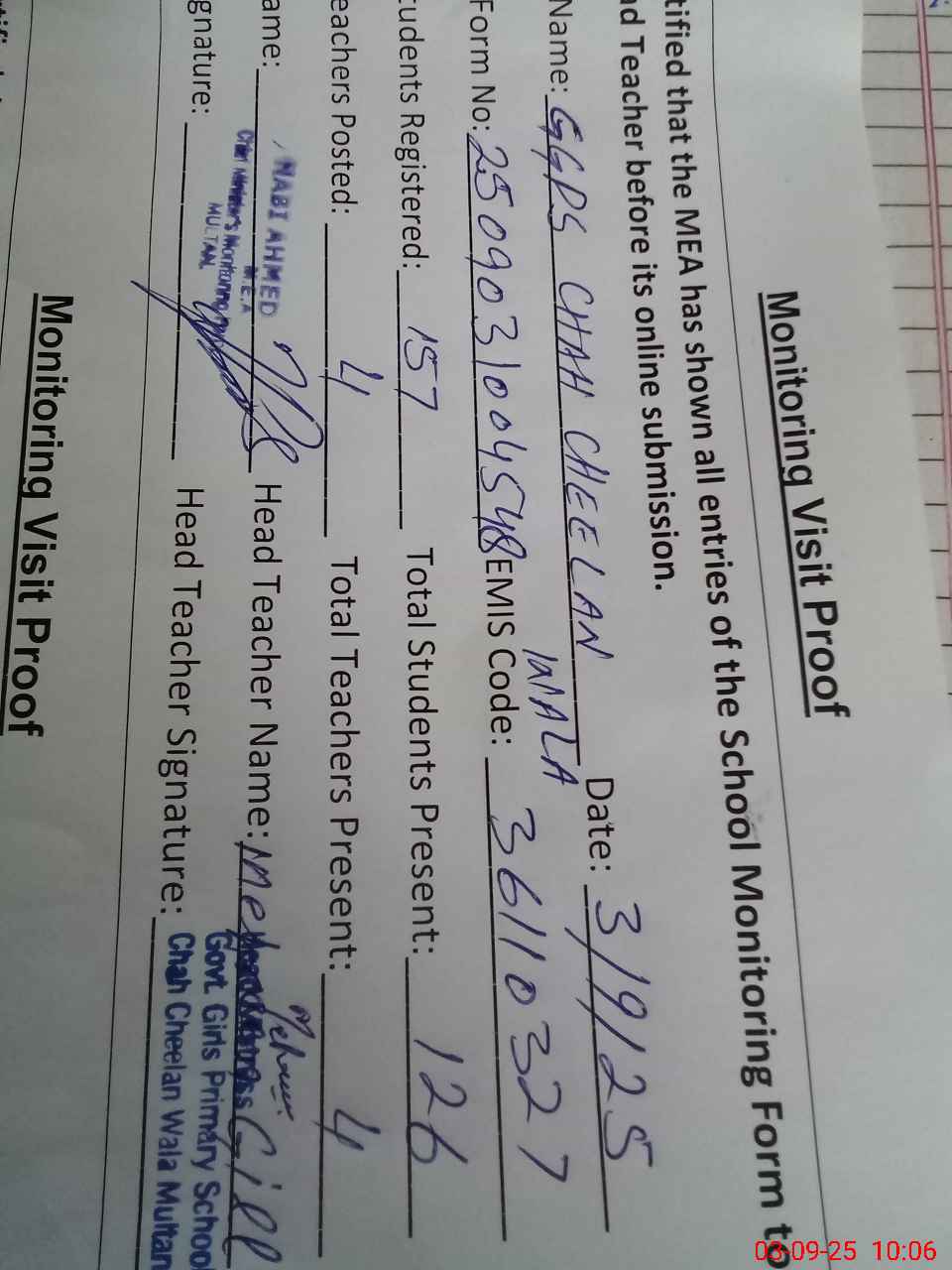 | EMIS Code: 36110327 | Name of School: GGPS CHAH CHEELAN WALA MULTAN | |||