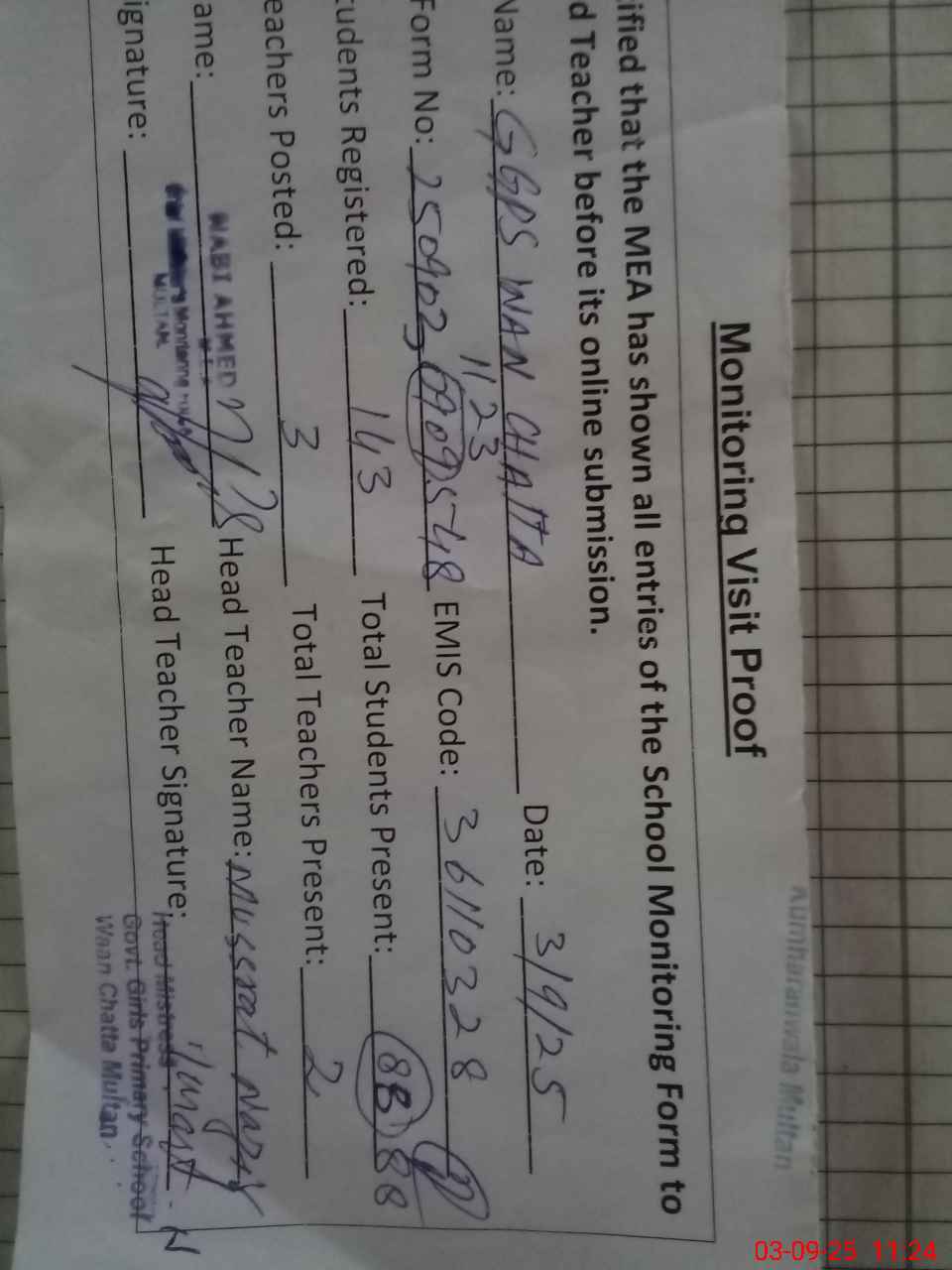 | EMIS Code: 36110328 | Name of School: GGPS WAN CHATTA BAHAWALPUR ROAD MULTAN | |||