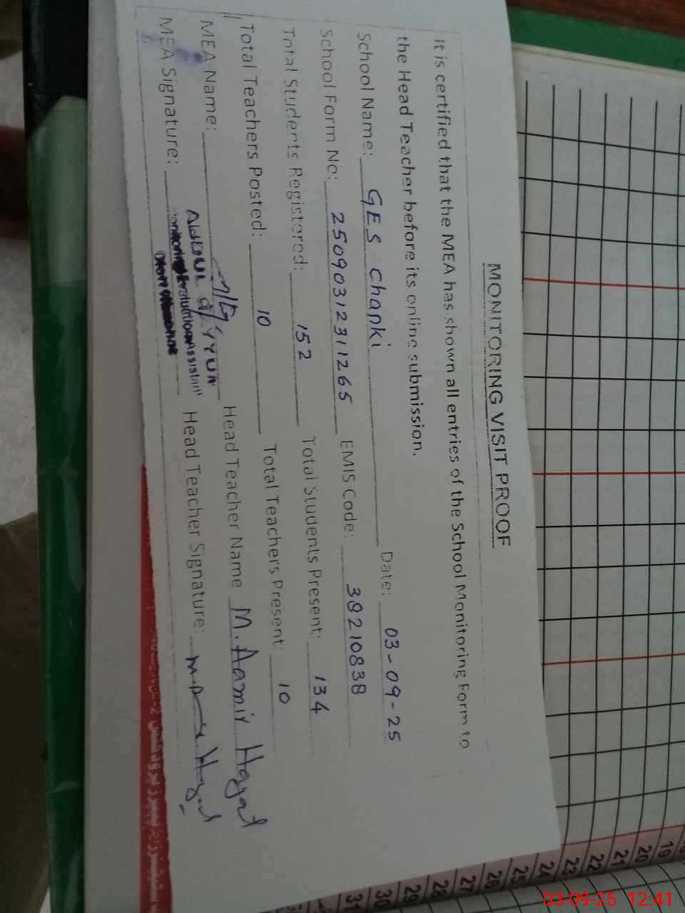 | Attendance Register | Head Teacher | MEA with School | Visit Proof |