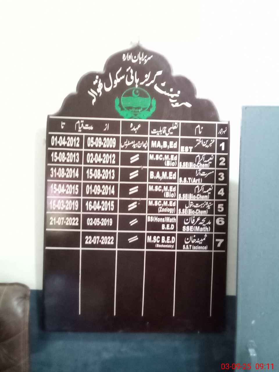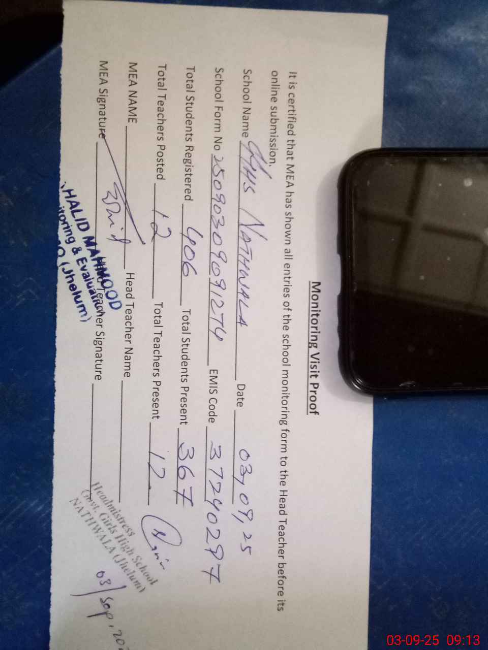| Name: Al**** Qa**** Designation: (School Headmaster's/Headmistress's) H T Phone/Cell Number: 03**** |