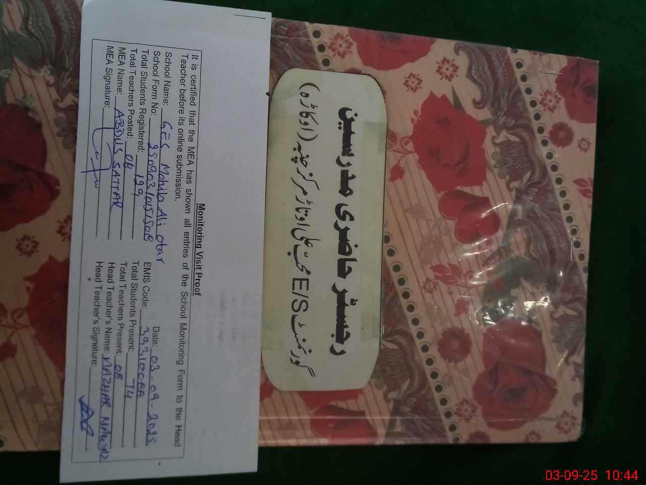 | Attendance Register | Head Teacher | MEA with School | Visit Proof |