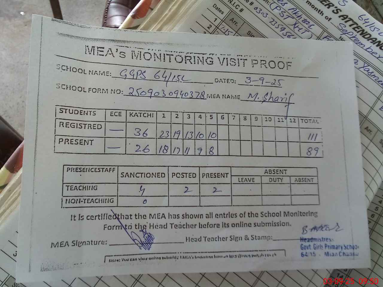 | Attendance Register | Head Teacher | MEA with School | Visit Proof |