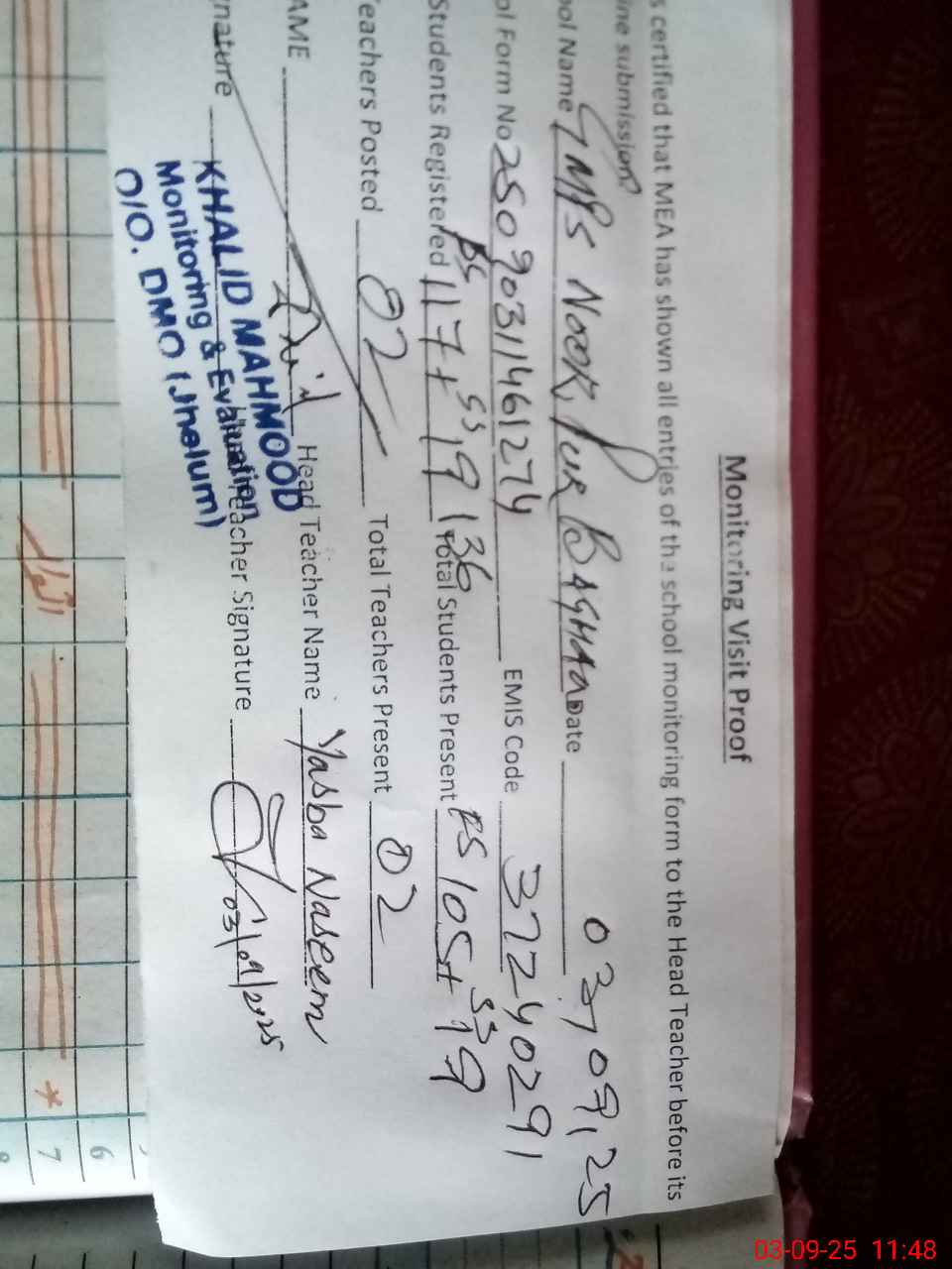 | Certified that this School was Inspected by the Undersigned MEA/DMO Today and the Information Stated Above is as Per Record. | |||||