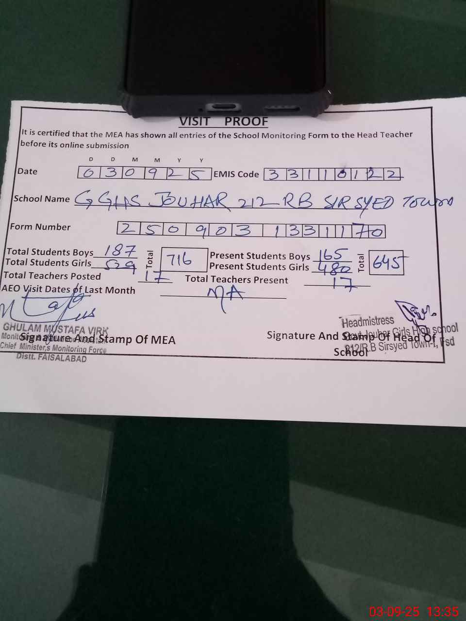 | Name: Sa**** Ta**** Designation: (School Headmaster's/Headmistress's) HEADMISTRESS Phone/Cell Number: 03**** |