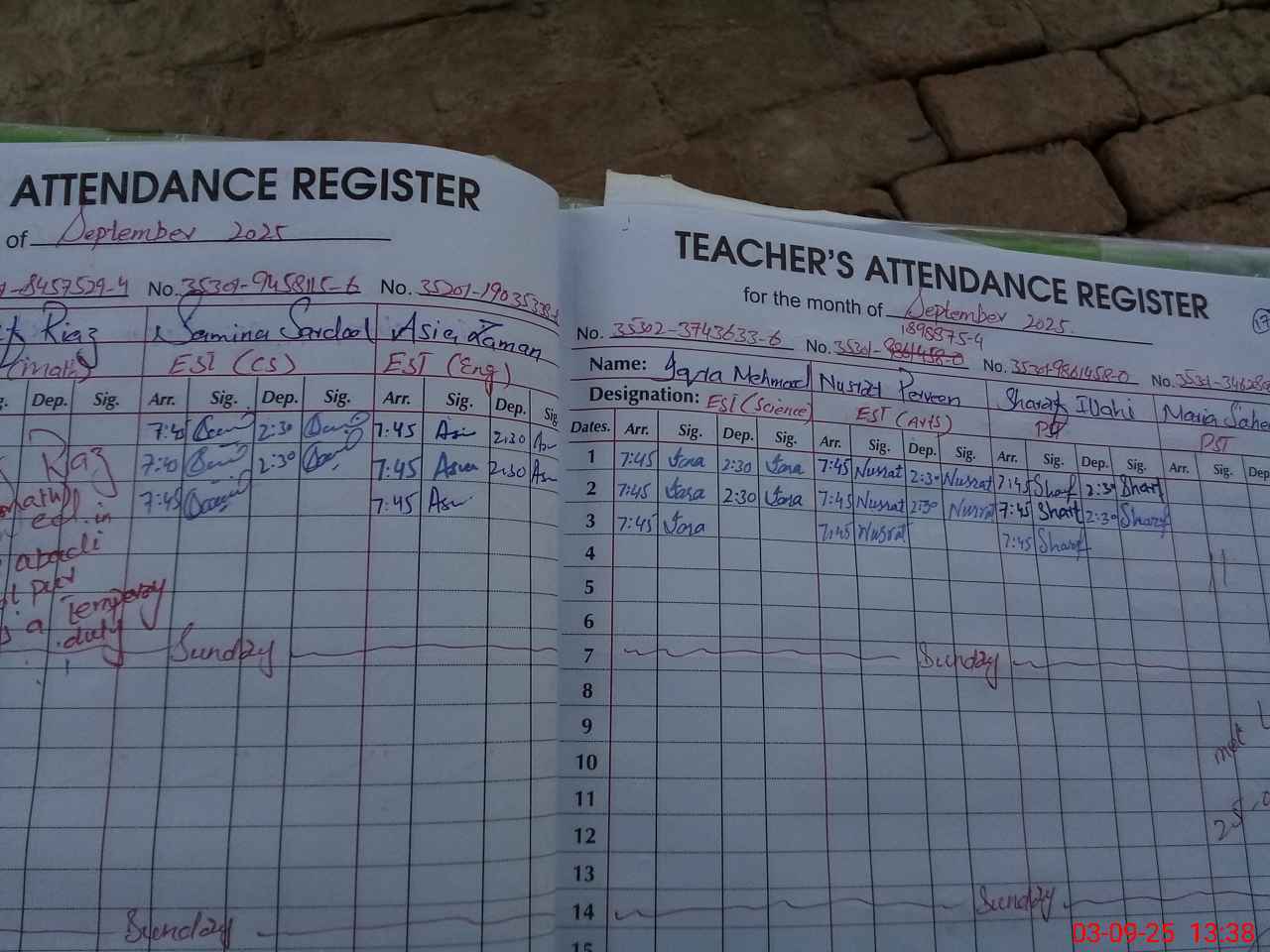 | Remarks (Use Separate Page if Required): Teacher Sadaf Riaz was marked on temporary duty in register but no authority letter was provided | |||||