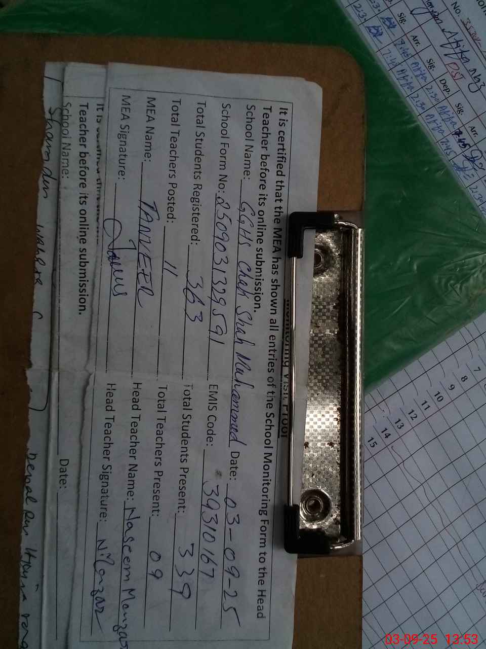 | Attendance Register | Head Teacher | MEA with School | Visit Proof |