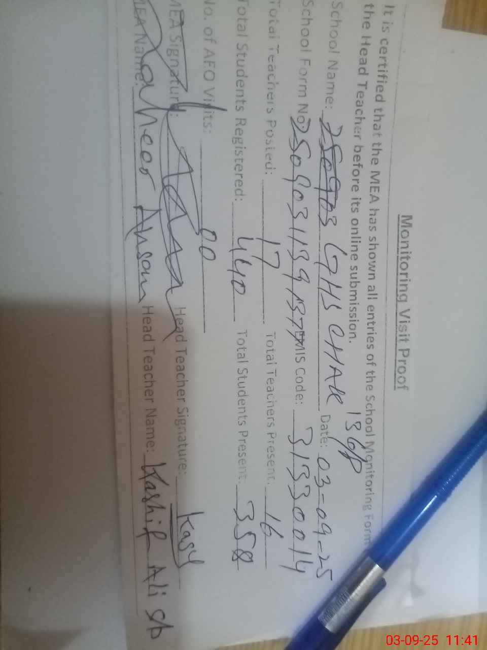 | Attendance Register | Head Teacher | MEA with School | Visit Proof |