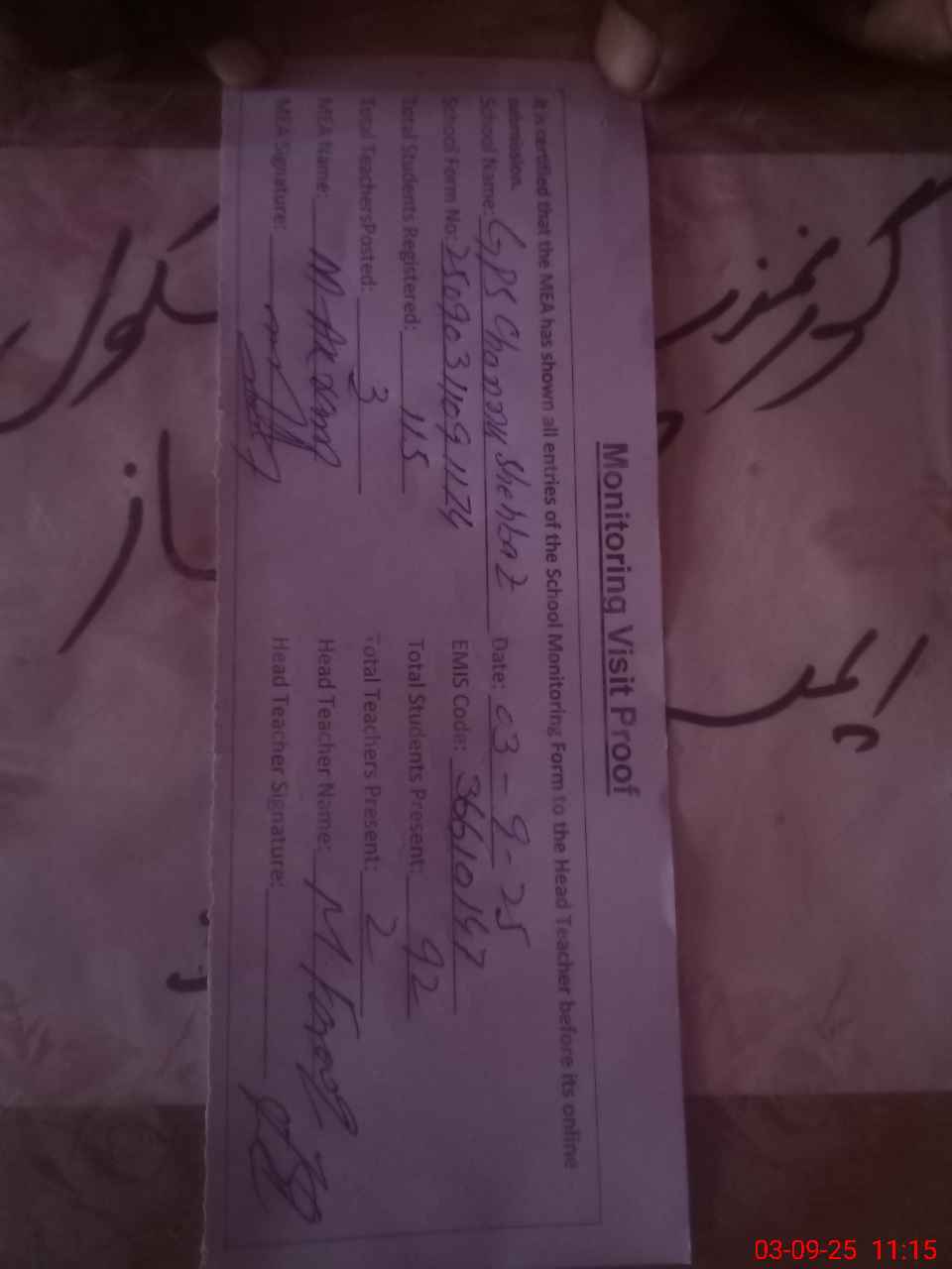 | Attendance Register | Head Teacher | MEA with School | Visit Proof |