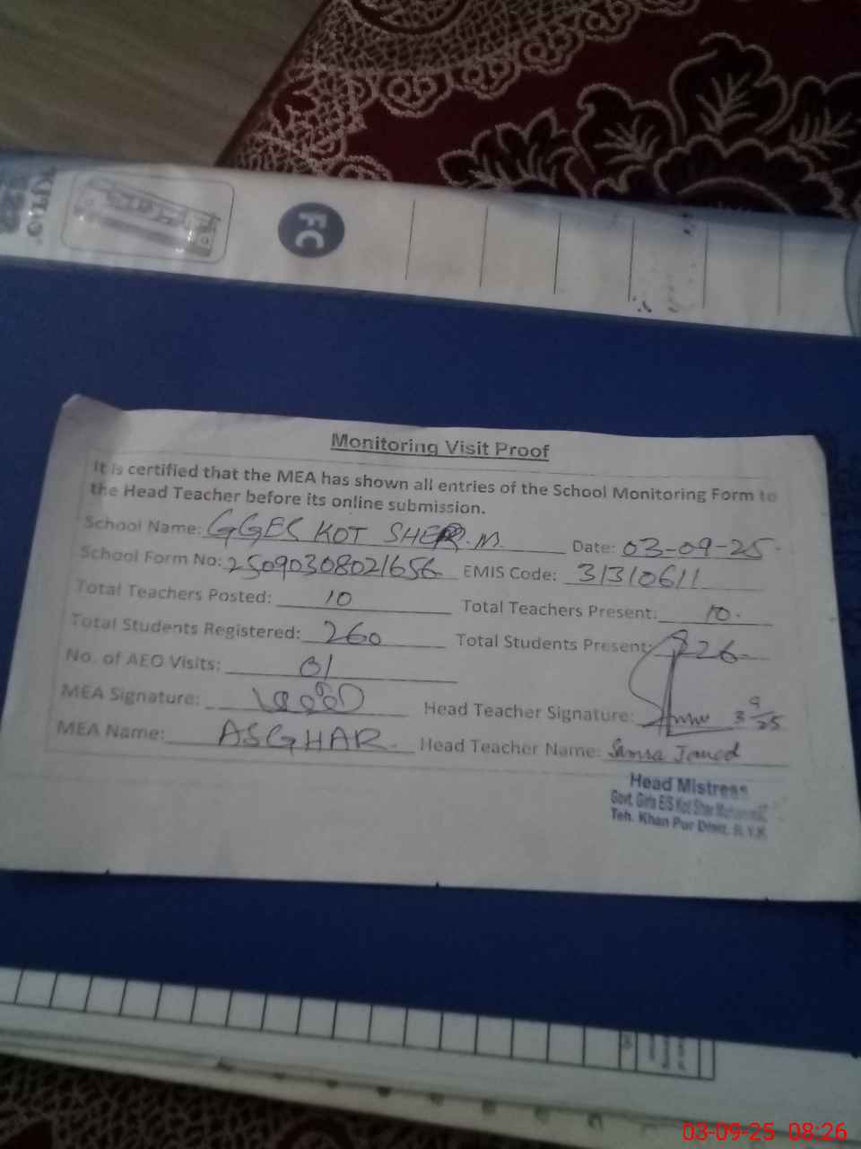 | Attendance Register | Head Teacher | MEA with School | Visit Proof |