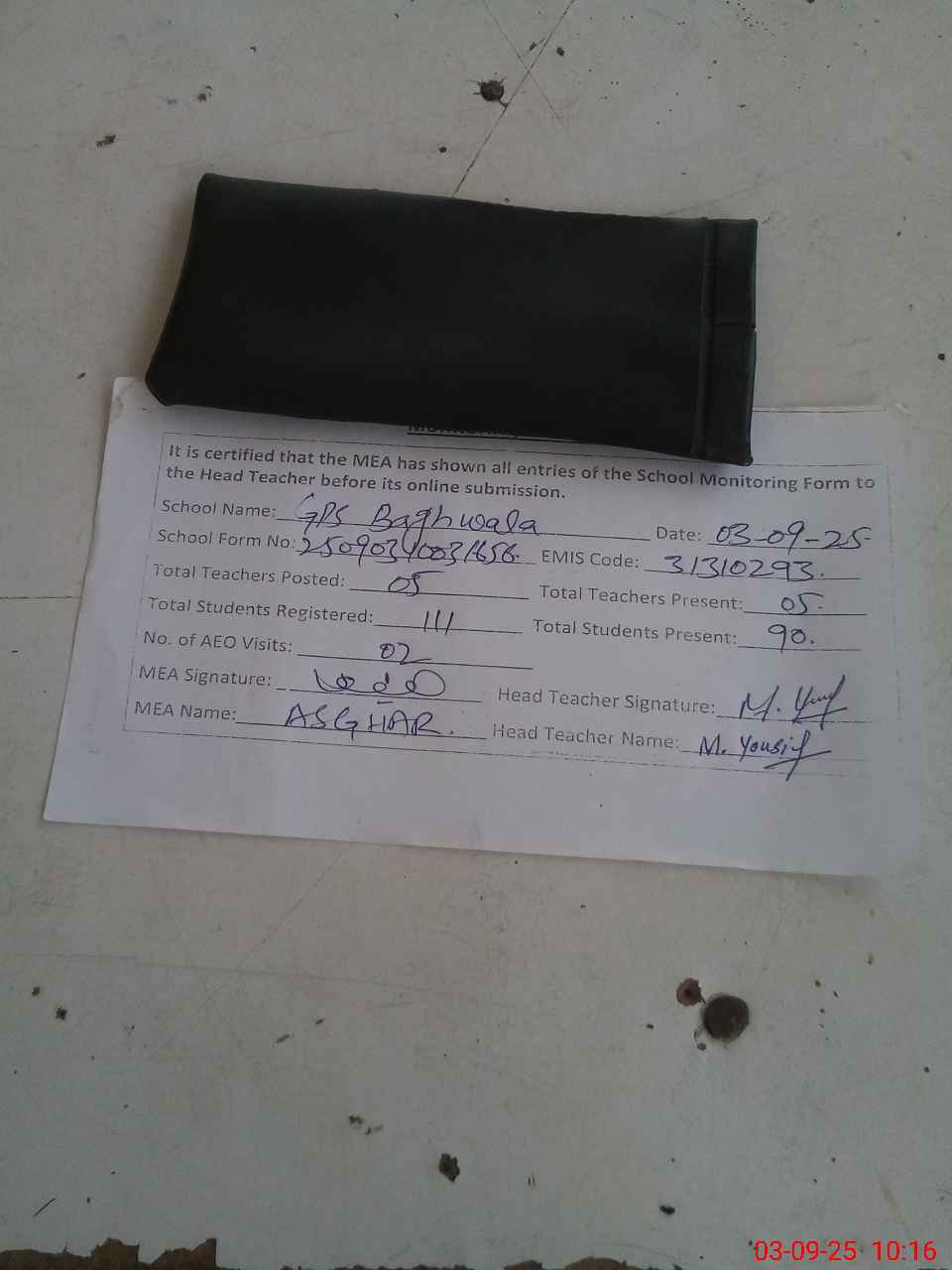 | Attendance Register | Head Teacher | MEA with School | Visit Proof |