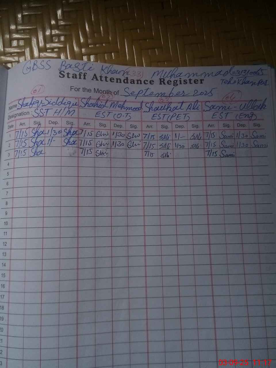 | Name: SH**** AH**** SI**** Designation: (School Headmaster's/Headmistress's) IC SST (G) Phone/Cell Number: 03**** |