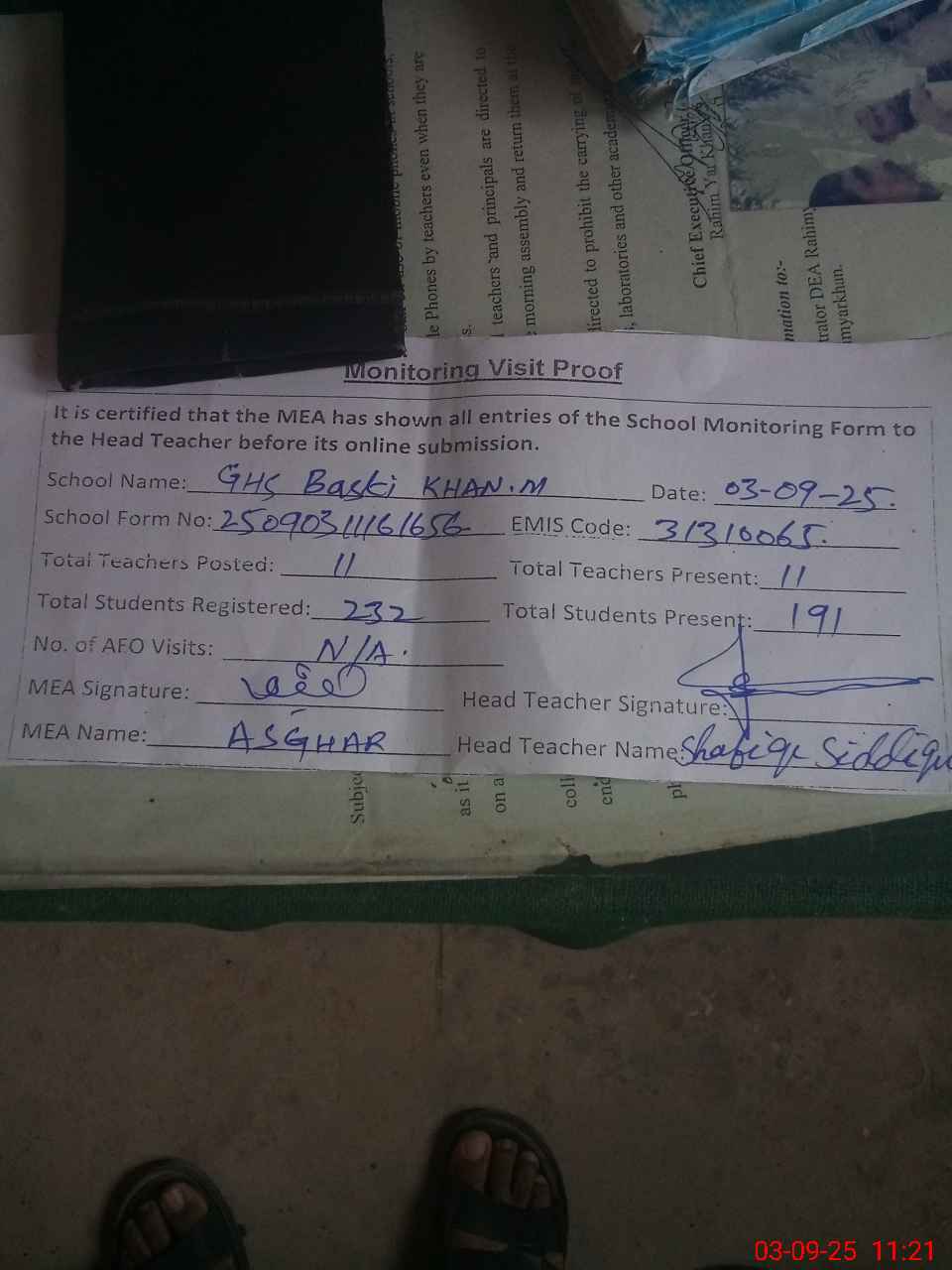 | Attendance Register | Head Teacher | MEA with School | Visit Proof |