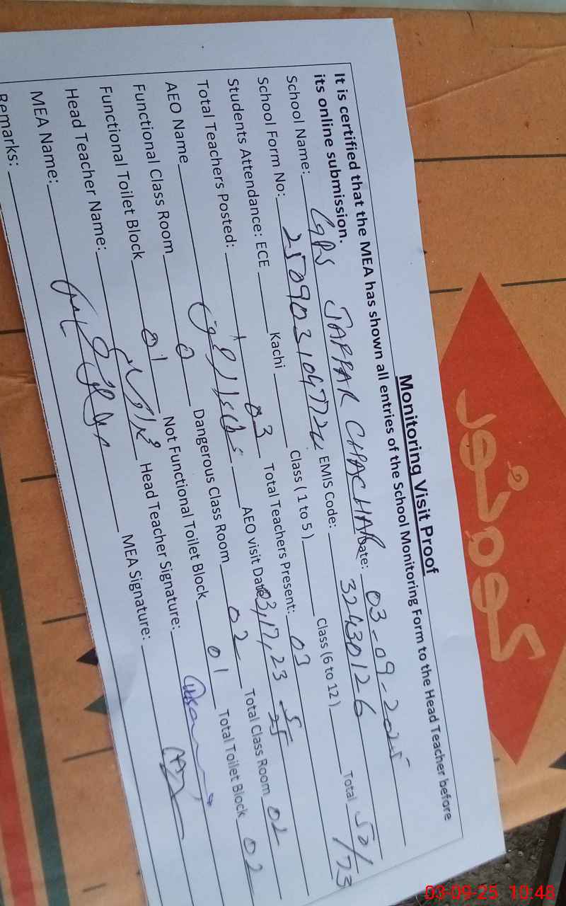 | EMIS Code: 32430126 | Name of School: GPS JAFFAR CHACHAR | |||